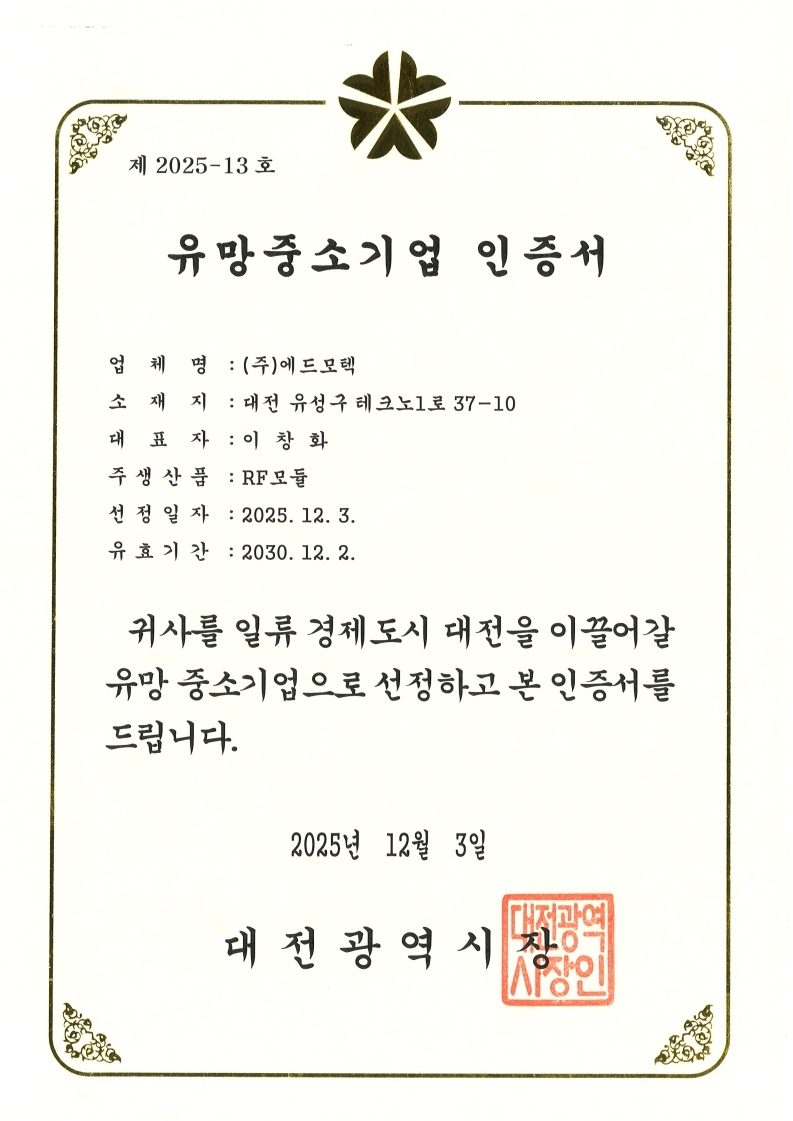 유망중소기업인증서_제2025-13호 페이지 정보 작성자 관리자 작성일 24-06-13 14:03 조회 1,041회 댓글 0건 본문 . 이전글소재부품장비전문기업확인서_제34263호 다음글첨단기술기업 지정서 목록 댓글목록 0 댓글목록 등록된 댓글이 없습니다.